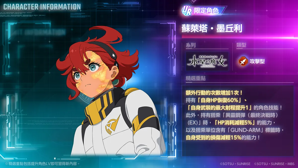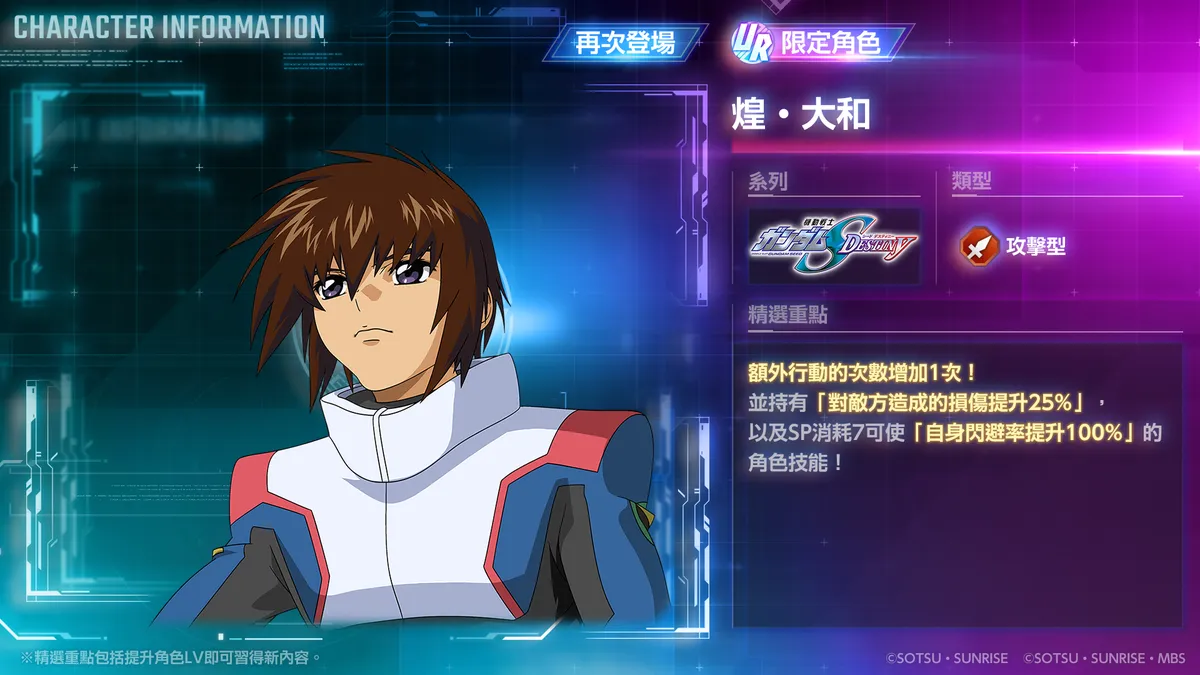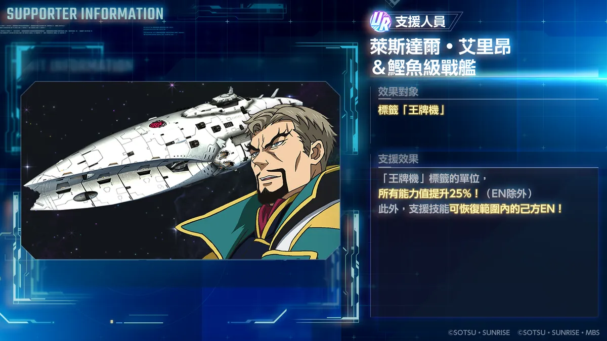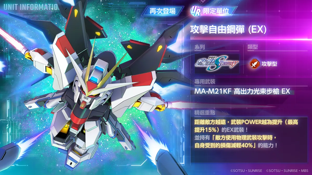 此外,UR「命運鋼彈(EX)」/UR「真‧飛鳥」、UR「異靈鋼彈(最終決戰時)(EX)」/UR「蘇萊塔‧墨丘利」、UR支援人員「塔莉亞‧庫拉提絲&智慧女神號」,以及UR「攻擊自由鋼彈(EX)」/UR「煌‧大和」、UR支援人員「拉克絲‧克萊因&永恆號」等復刻陣容,也會持續於已推出的精選機體補給中與各位玩家見面!