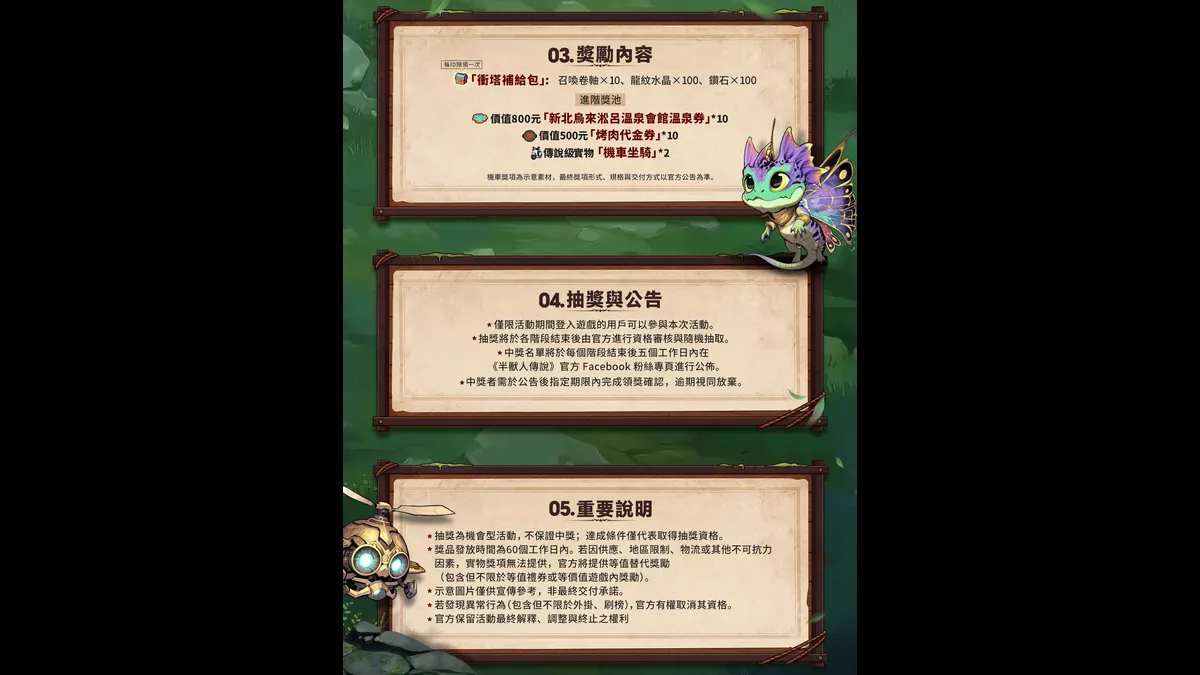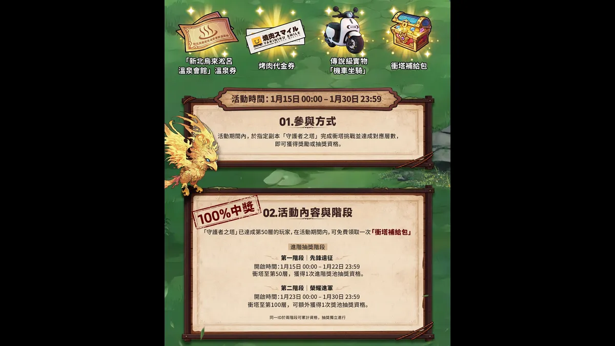 為了歡慶上線,官方同步開啟第一期「守護者衝塔挑戰賽」。自1月15日起至1月30日,玩家只要在指定副本挑戰衝塔層數,即可獲得100%中獎的禮包回饋與實體獎勵抽獎資格。獎項內容極其「貼心」,除了豐富的遊戲資源,更有500元「燒肉Smile現金抵用券」、800元「新北烏來淞呂溫泉會館溫泉券」,甚至還有傳說級「機車」大獎等豪禮奉上,落實半獸人「能吃又能打、管吃又管住」的豪氣承諾。【守護者衝塔挑戰賽】活動重點速覽: