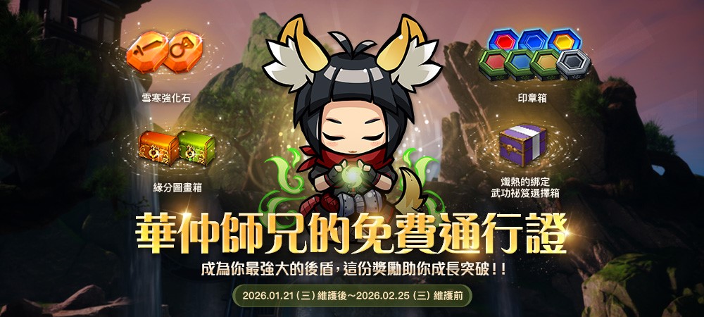 【華仲師兄的免費通行證】:於遊戲內推播獎勵免費領取「華仲師兄的通行證票券」,完成指定任務提升通行證分數,即可獲得多樣成長道具.