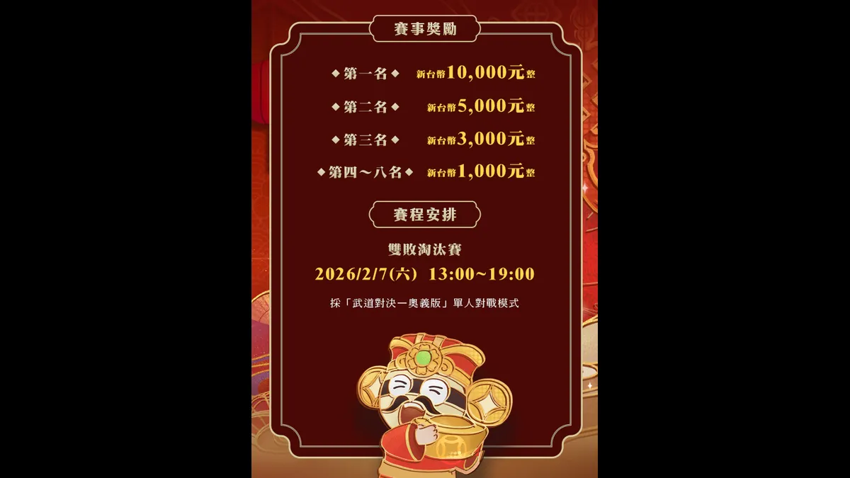 新的一年,第一包紅包不靠運氣、只憑實力!歡迎豪傑們踴躍報名挑戰,在新春之際為自己博個好彩頭。賽事名額與報名時間有限,也提醒有興趣的玩家把握機會、及早報名,以免錯過新春首戰!