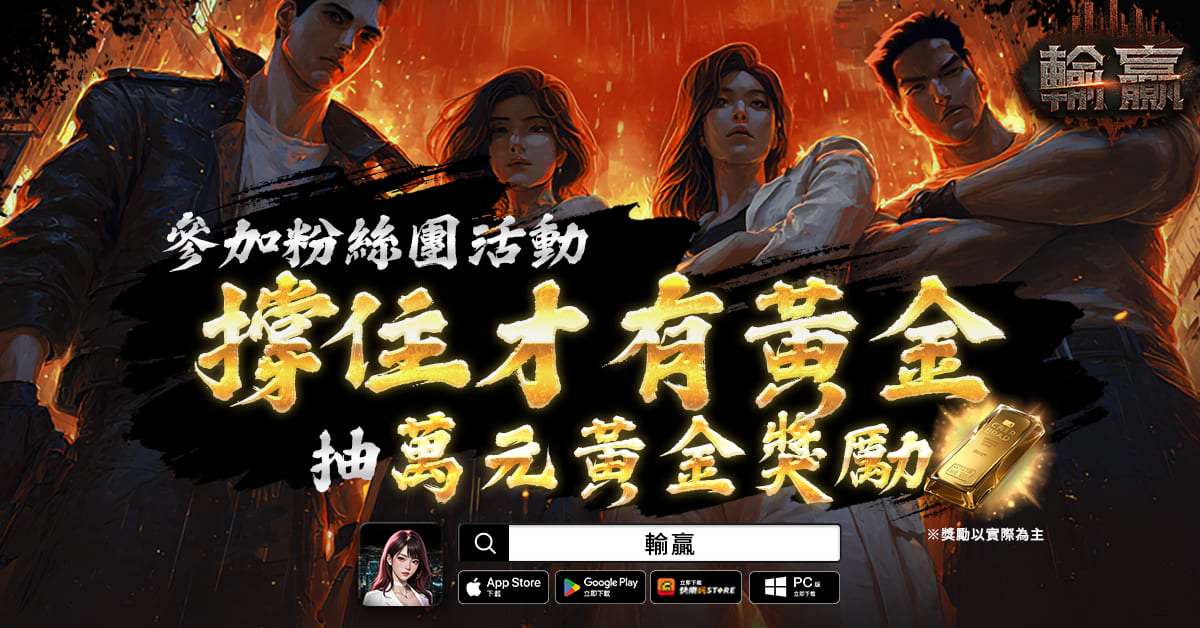 不僅如此,《輸贏》官方粉絲團同步舉辦上市限定活動。活動期間內,玩家只要參與回答貼文內的問題,並留下自己的角色名稱,即可獲得「強化石手提箱」、「現金隨機手提箱」和「蔘雞湯(力氣)」等虛寶好禮,而若回答的是正確答案,還可獲得實體「黃金」的抽獎機會。更多活動詳細說明及相關規則,請見官方網站及官方粉絲團說明.