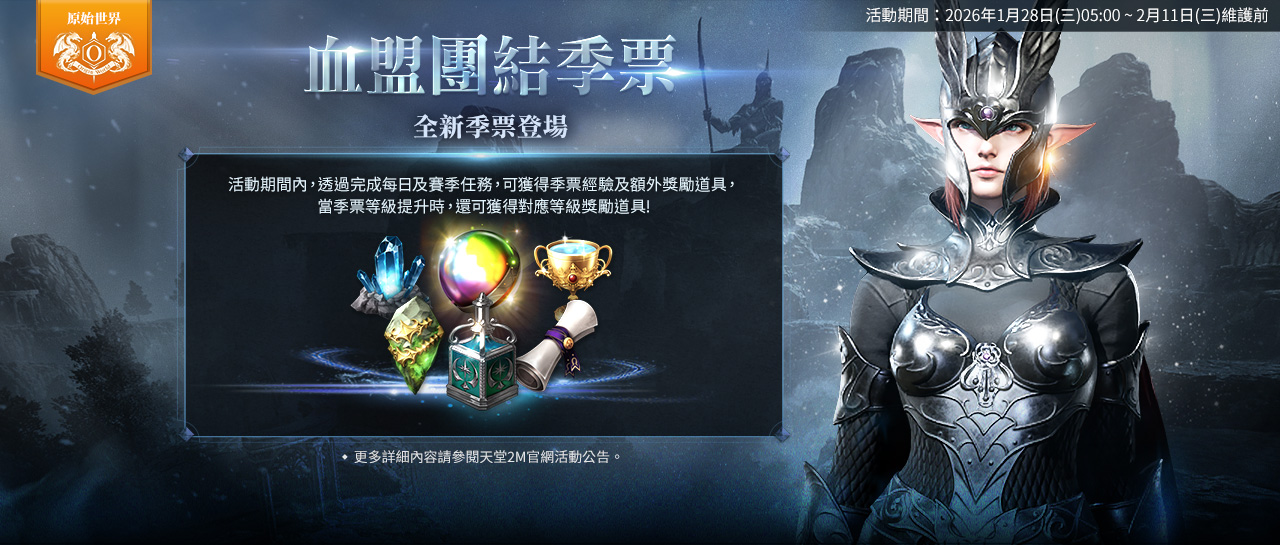 原始世界【血盟團結季票】:1/28維護後~2/11維護前,活動期間內,進行全新季票活動「血盟團結」,透過完成每日及每季任務,可獲得季票經驗值,當季票等級提升時,可獲得對應等級獎勵道具。使用金幣開啟優質獎勵時,可額外獲得更多的獎勵報酬。