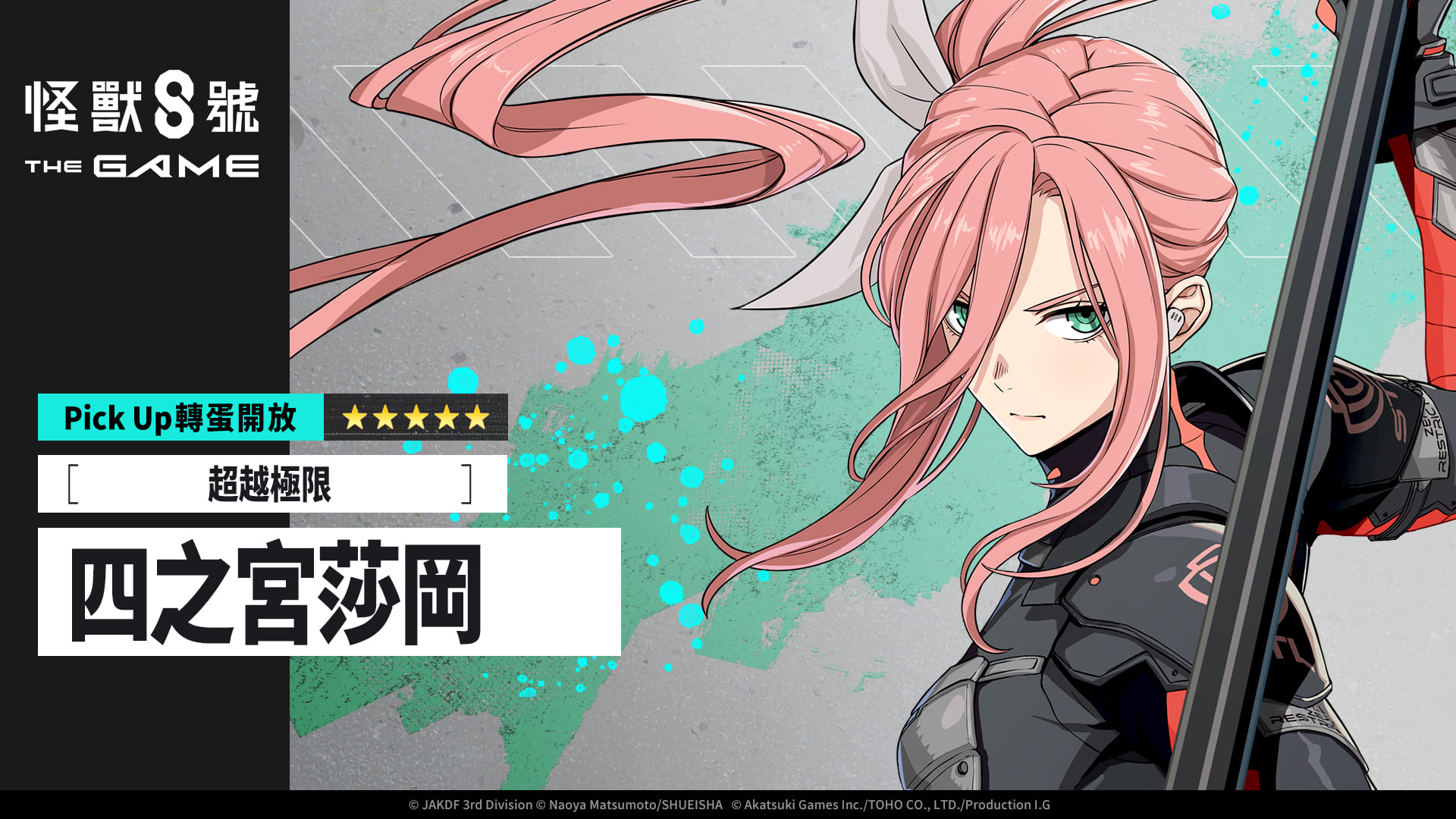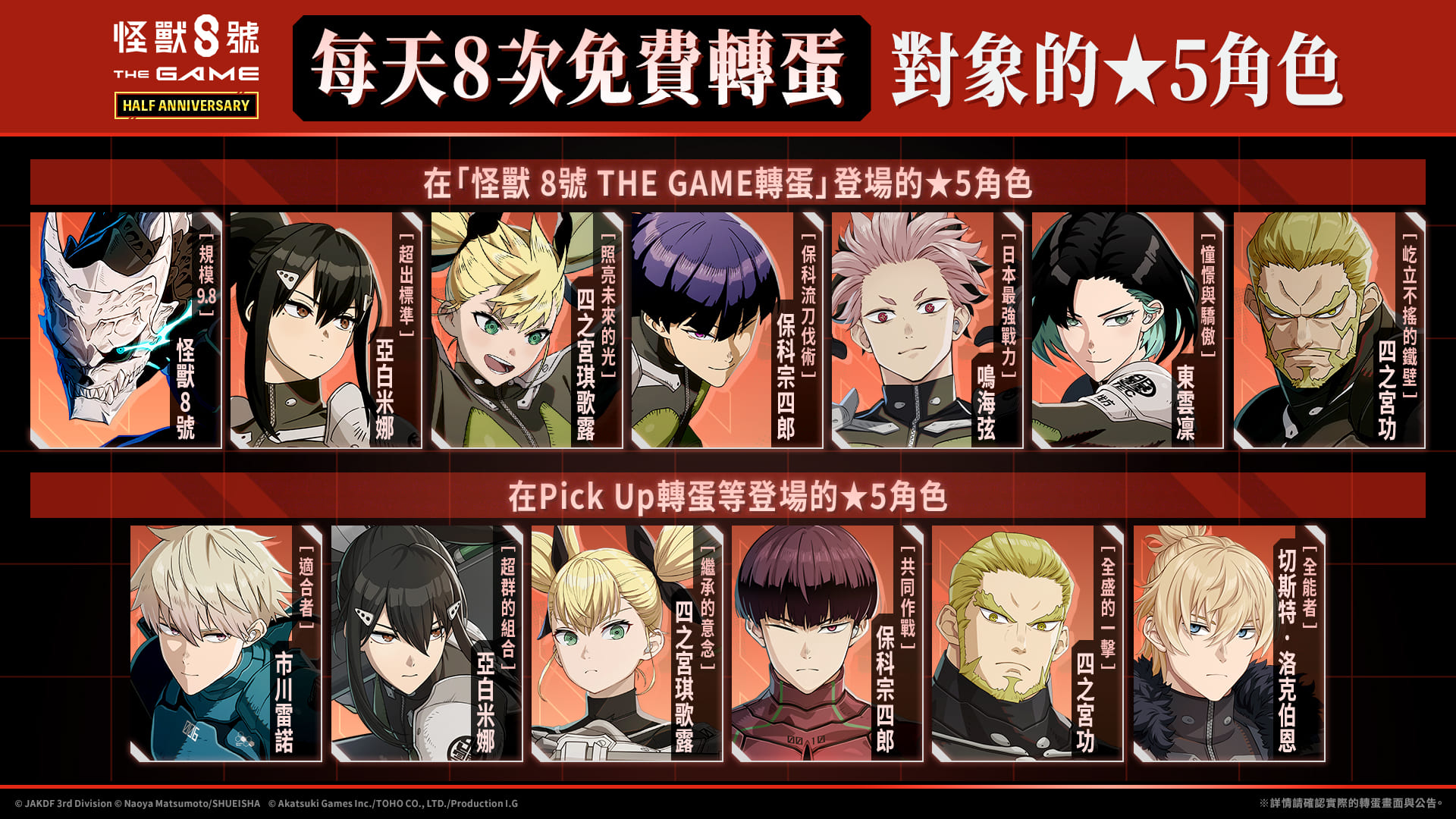 由 Akatsuki Games、TOHO 以及 Production I.G, 共同製作的智慧型手機與 PC 遊戲「怪獸 8號 THE JUEGO」今日宣布推出豐富的半週年慶祝活動!不只主線劇情中,隊員們將進入「異次元」的全新領域展開激戰,各式活動獎勵規模更是將突破異次元級別的天花板!除了80 次免費轉蛋以外,還可從登入獎勵和活動報酬獲得多達 30.000 個次元晶!全新 ★5角色[超越極限]四之宮莎岡也滂礡登場,將展現超越以往的戰鬥姿態。更別錯過再次開放的★5[共同作戰]保科宗四郎,以及付費限定必中 ★5 轉蛋!