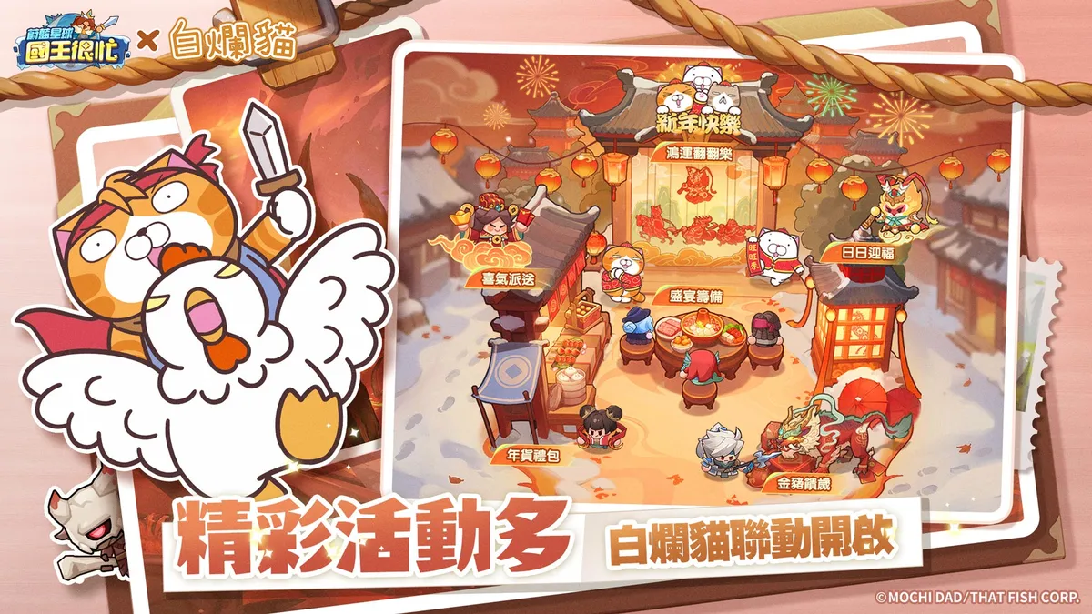 《蔚藍星球:國王很忙》今(3)日正式宣布,將於2月10日推出與超人氣IP「白爛貓」的新春聯動活動!官方表示,本次聯動版本將帶來限定造型「白爛貓」、「擺爛」貼圖及專屬聯動玩法,春節期間就讓白爛貓家族陪玩家一起白爛開鬧、輕鬆暢玩!