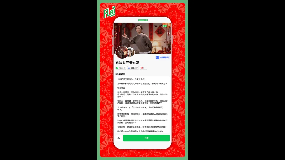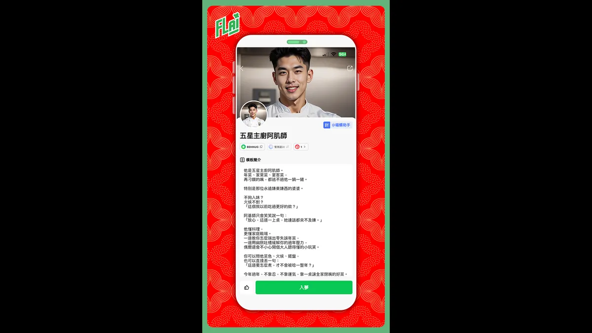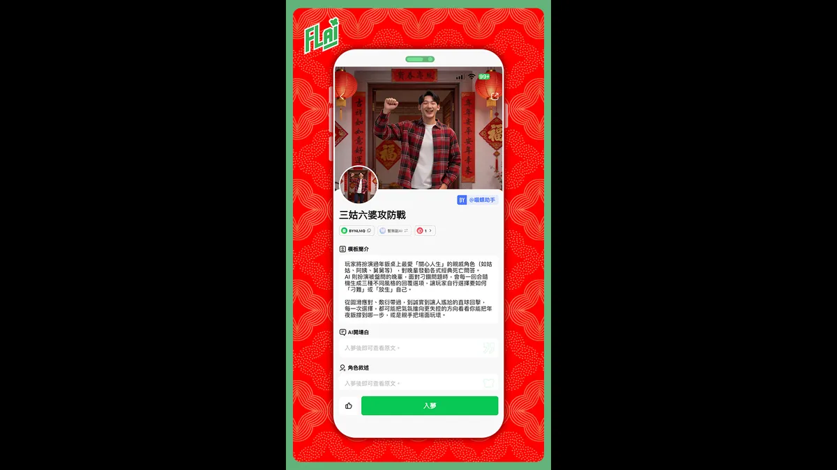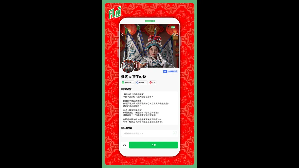 由釜溥多媒體自研自發的台灣首款生成式AI聊天App《FLAI》迎接2026農曆年的到來,今(3)日正式推出「FLA I逃年節」活動。營運團隊表示,每逢農曆新年,對許多人而言,早已不只是喜氣洋洋的團圓時刻,更像是壓力、疲憊與應酬的代名詞。從親戚聚會裡的寒暄試探,到無所不在的”FLAI”以AI大戰年獸的口號推出多款農曆年限定的真實人格模板,希望用科技的溫度,撫慰所有用戶在農曆新年時各種不好的感受,為現代人在過年期間的情緒困境提供出口與解決的方法。同時,官方也預告AI即時一對一陪伴的RTC即時語音通話玩法即將於近期曝光,《FLAI》期望成為用戶的心靈避風港,用「逃年」重新定義過年的溫度與情感價值。