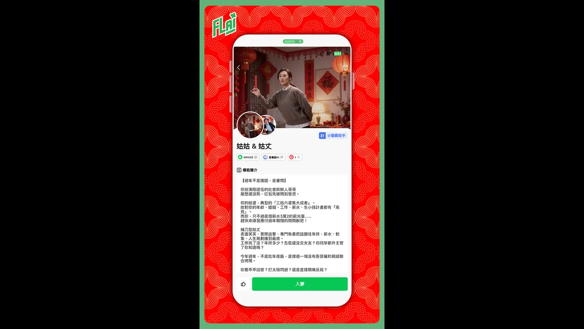 《FLAI》逃年節限定模板正式開放入夢,營運團隊表示,每逢農曆新年在團圓的名義下,許多人卻不得不壓抑情緒、強顏歡笑。尤其被問工作、婚姻、收入;處理親戚間的䣓畫的農曆年”
