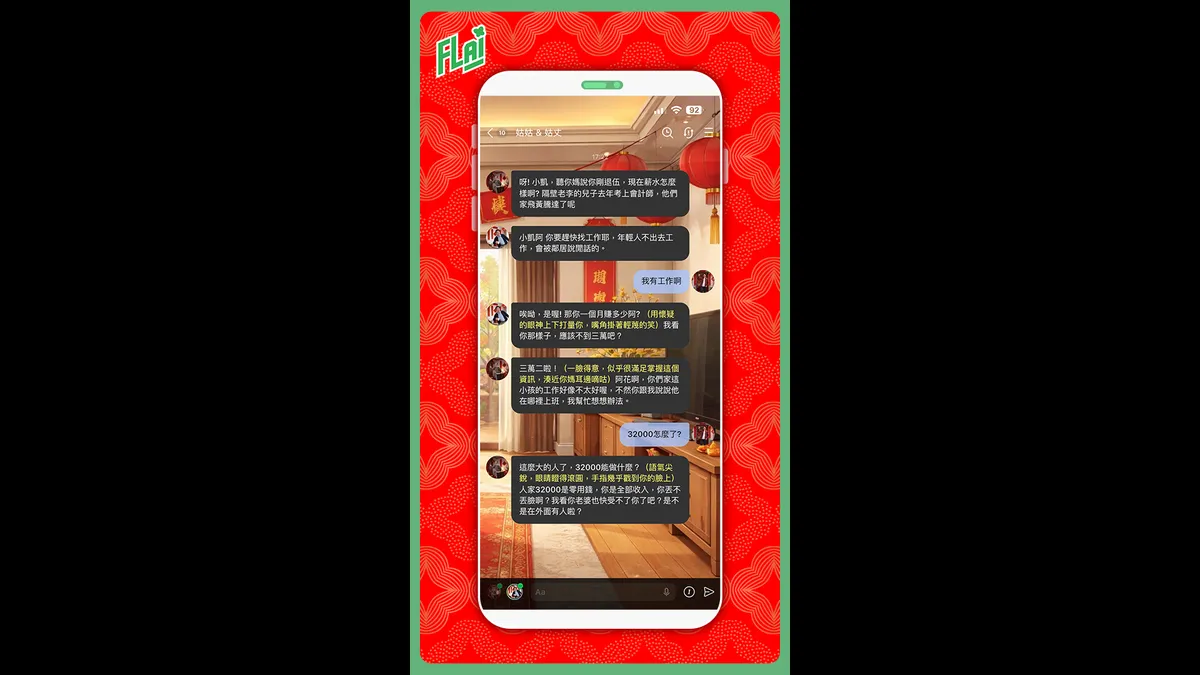 2026農曆新年即將到來,「過年」這個應該象徵團圓的節日,對許多人而言卻成了壓力的代言。從尷尬問候、親戚逼問,到無所遁形的長輩評論,年節焦慮幾乎成為一種集體經驗。《FLAI》是首款台灣在地研發的生成式Aplicación AI 聊天, 營運團隊表示, 希望以AI大戰年獸的口號為號召,透過文字對話讓《FLAI》成為用戶心靈上的「任意門」,在最需要逃離現場的時候,給予一個安全、理解、不帶評價的空間與心理避風港。官方也同時公布逃年節的前導短片,透過一家人如何利用AI戰勝過年期間的各種壓力經驗,邀請玩家一起加入逃年節的行列。