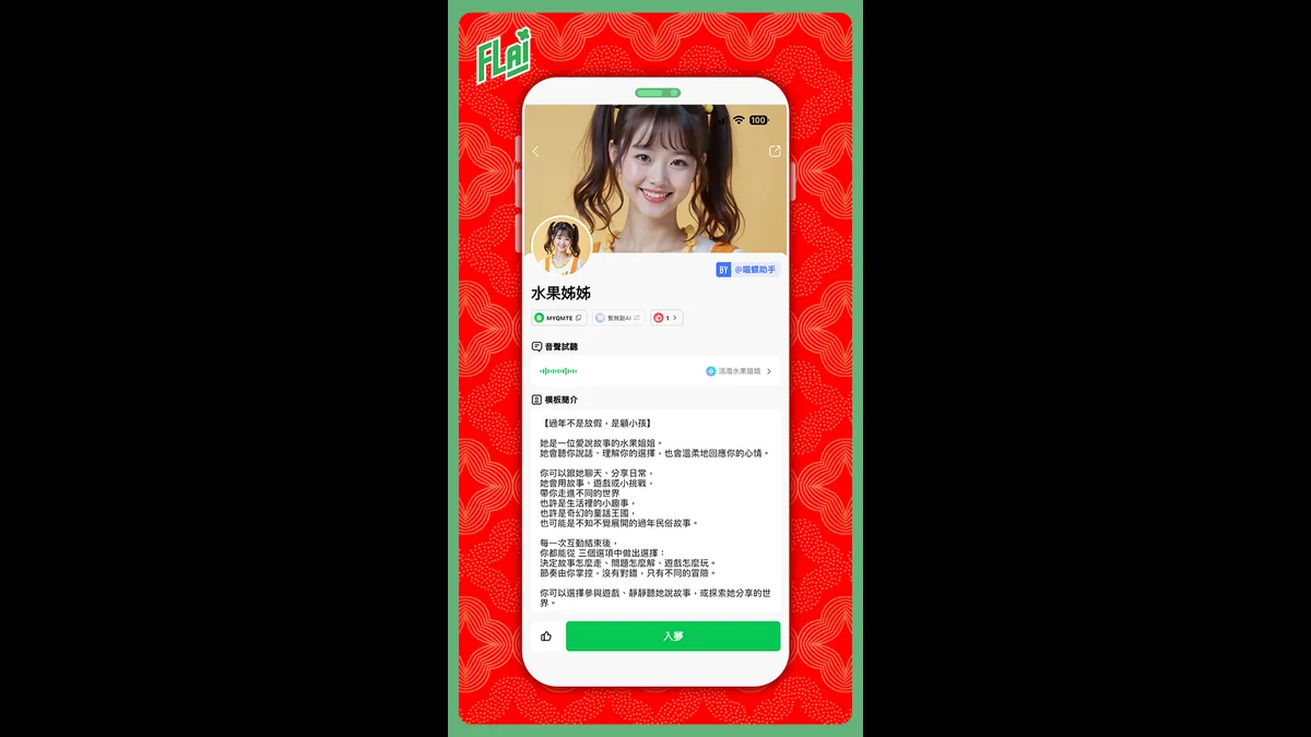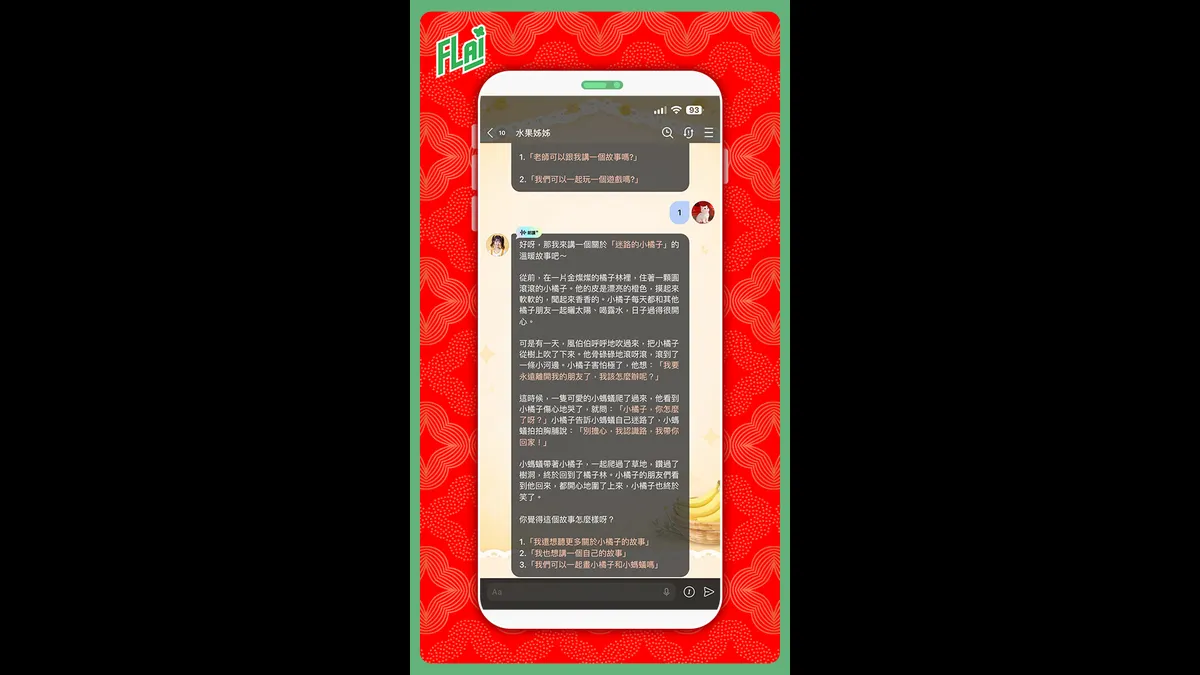 過年不是放假,是全職顧小孩。於是最懂孩子的AI水果姐姐登場了!水果姐姐在這場年節戰場中,成為你最溫柔的救援。說故事、玩遊戲、解任務,每一次互動都有選擇權。想逃離喧囂,就跟著她走進一場自在又療癒的小冒險。