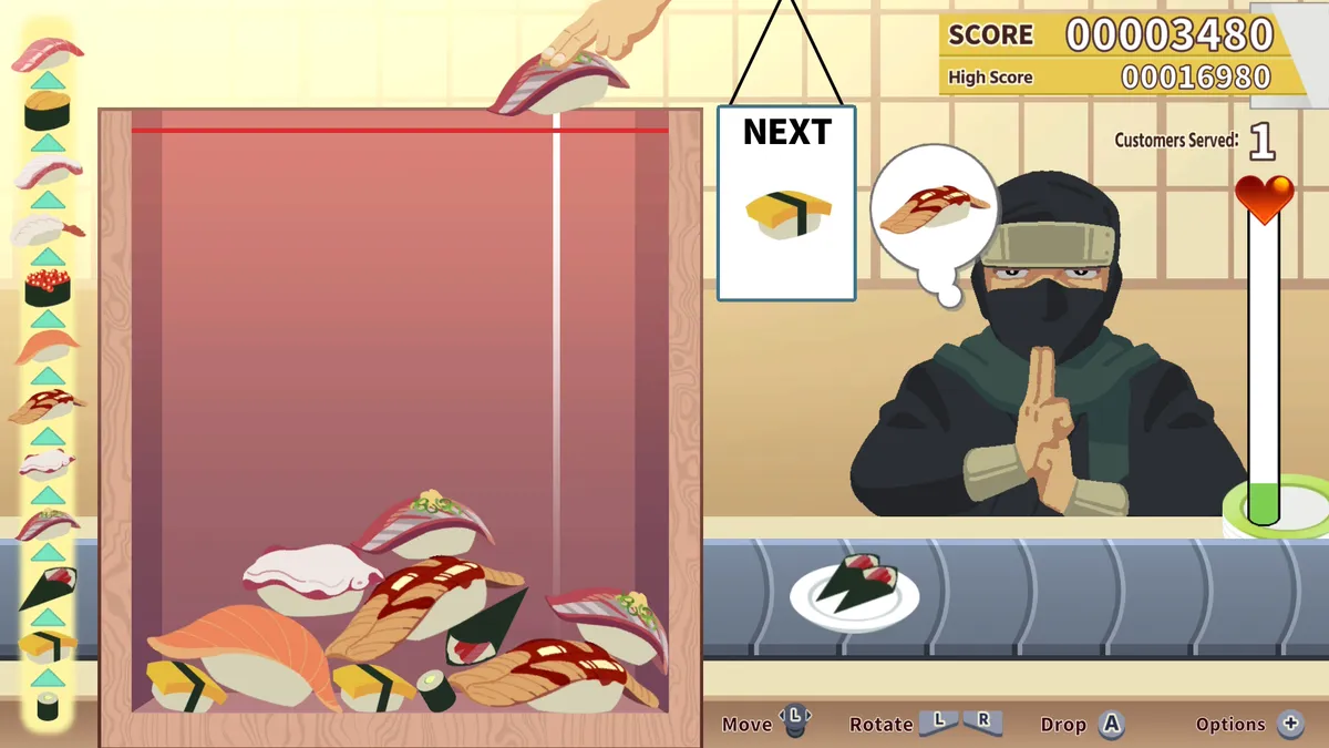 身為壽司職人的你,需要不斷將壽司投放進箱子裡,使相同的壽司碰撞合併,從而捏出更加豪華的壽司.