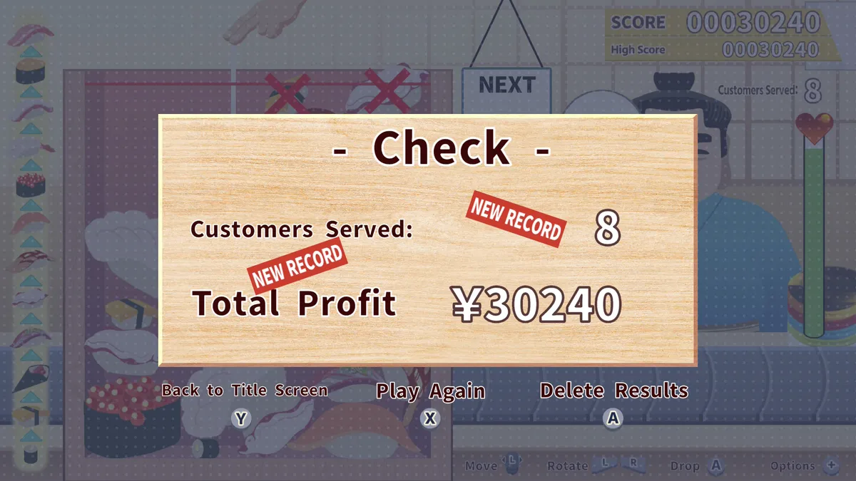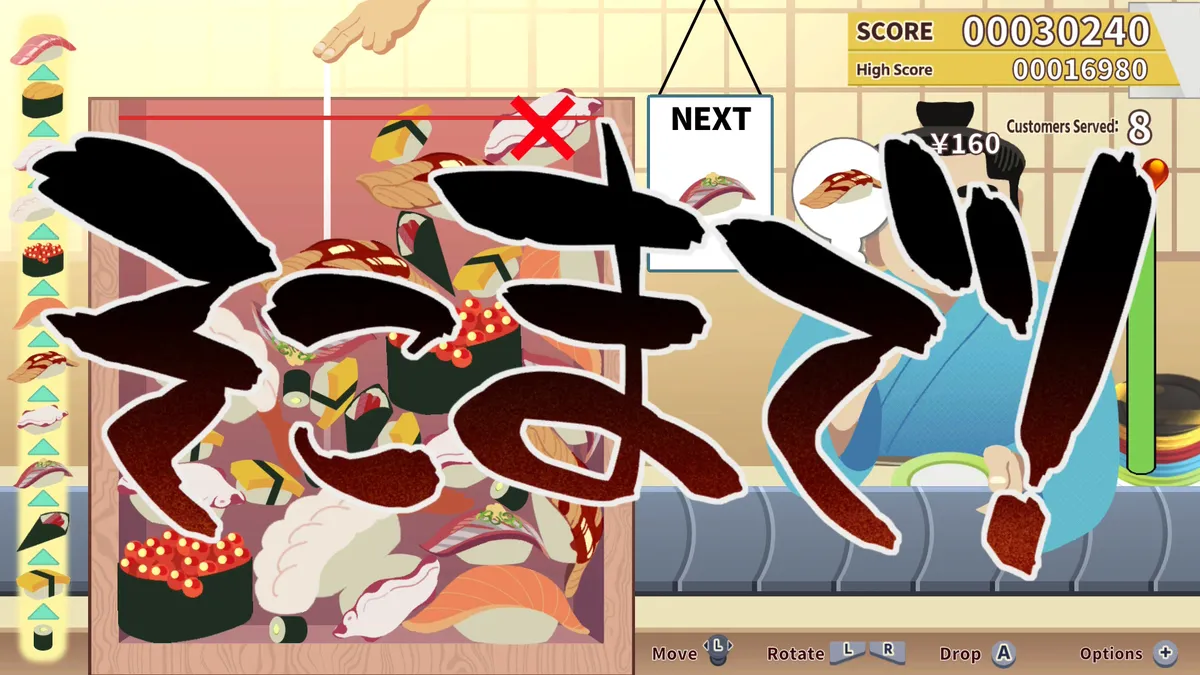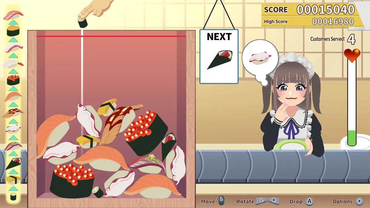 這款遊戲並不是單純地讓壽司越變越大。完成的壽司會被自動放上傳送帶,送到在吧檯等待的客人面前.