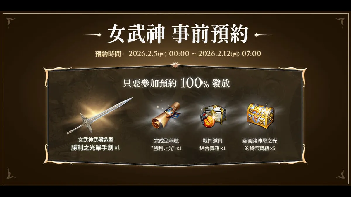 為迎接新職業登場,官方同步推出女武神事前預約活動。凡參與事前預約的冒險家,活動期間即可獲得多項遊戲道具,包含職業稱號「勝利之光」、職業武器造型「勝利之光單手劍」、「戰鬥道具綜合寶箱」與「蘊含路沛恩之光的貨幣寶箱」,幫助冒險家在新版本中順利啟程.