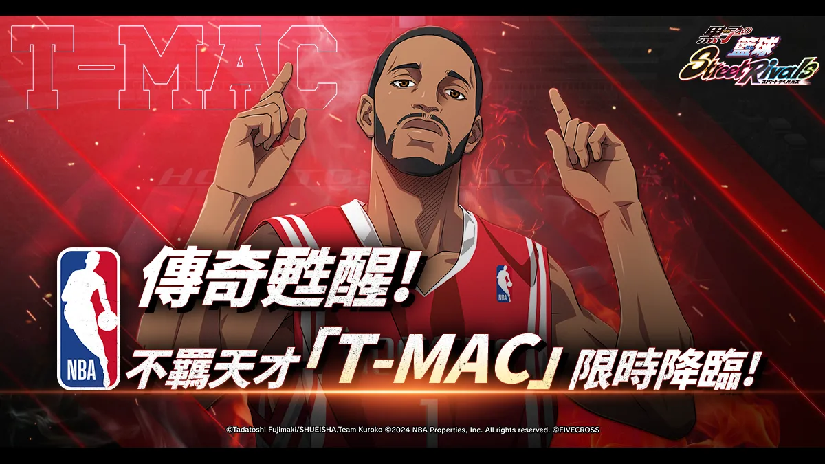 Calle FIVECROSS今日宣布,改編自日本人氣籃球動畫,最奇蹟熱血的籃球競技對戰手遊《黑子的籃球. Rivales》,推出全新聯動及球員角色『T-MAC崔西·麥葛瑞迪』。玩家們準備好了嗎?接下來要面對的可是真正的NBA傳奇球星!