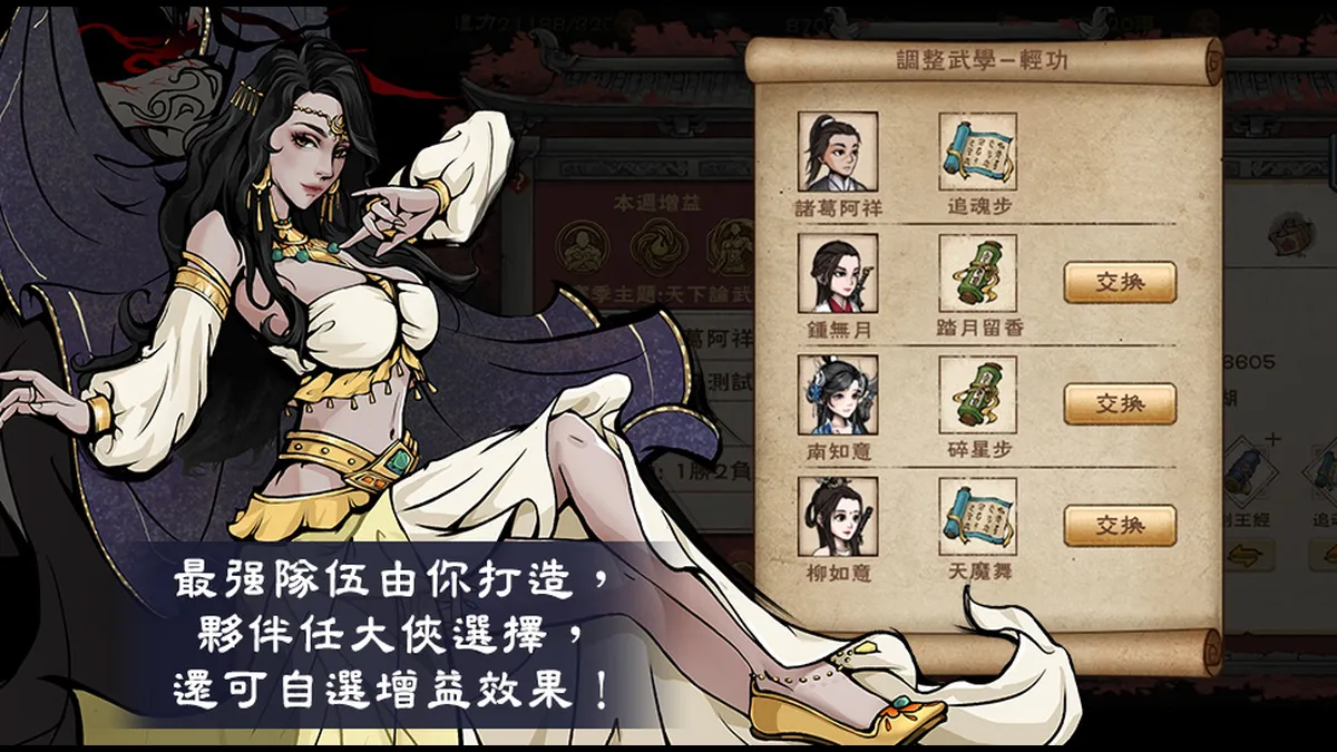 夥伴搭配最合適武學,增益效果再加乘!最強隊伍由你鑄造!
