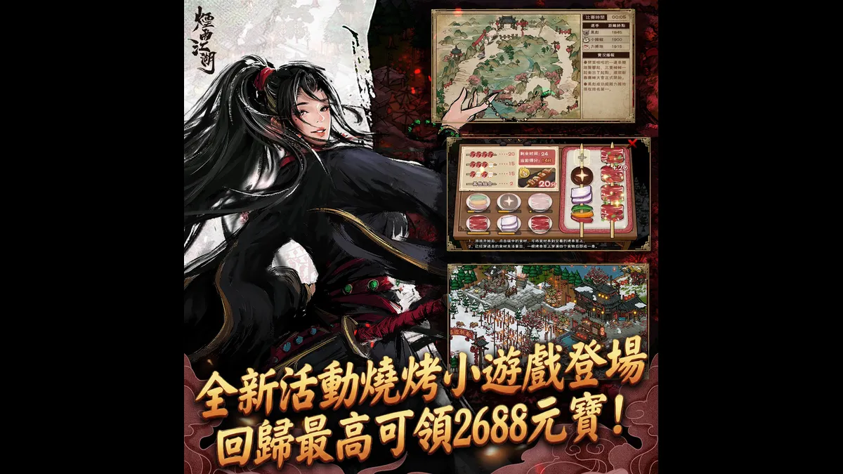 同時,為了迎接馬年的到來,《煙雨江湖》推出全新賽季制玩法內容,本屆賽季大俠將可以裝配所有非門派的鎮派武學,甚至能夠搶先體驗尚未獲得的武學內容!本次改版也推出一年一度的過年廟會地圖,在廟會中,將能夠獲得大量元寶,大俠在新春版本中最高可以獲得2688元寶,活動網頁總獎金15萬等你來獲取!