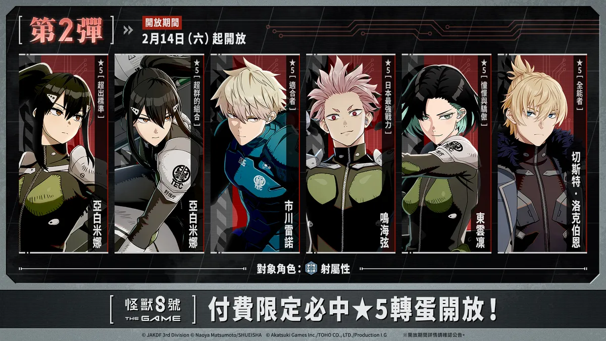 由 Akatsuki Games、TOHO 以及 Production I.G, 共同製作的智慧型手機與 PC 遊戲「怪獸 8號 THE JUEGO」今日宣布,接續第一彈的活動,半週年第二彈釋出了全新 ★5角色——吸收了平行世界力量而變身的[灼熱的異形]怪獸 8號。此外,新一彈紀念登入獎勵和付費限定必中 ★5 轉蛋也正式開放!