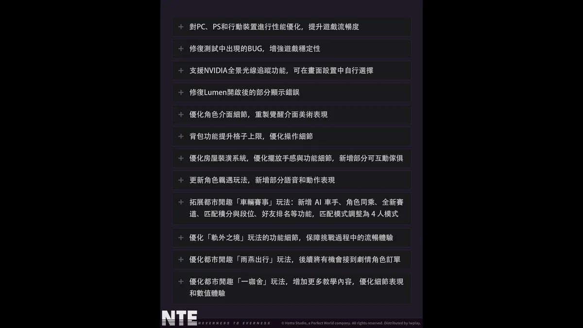 在「共存測試」期間,《異環》運營團隊收到了鑒定師大量且真情的支持與回饋,在迎接4月29日上市來臨之際,團隊將依據測試期間的建議持續進行整體體驗優化,包含修復已知問題、提升穩定度與操作流暢性,並同步強化角色表現與玩法內容.