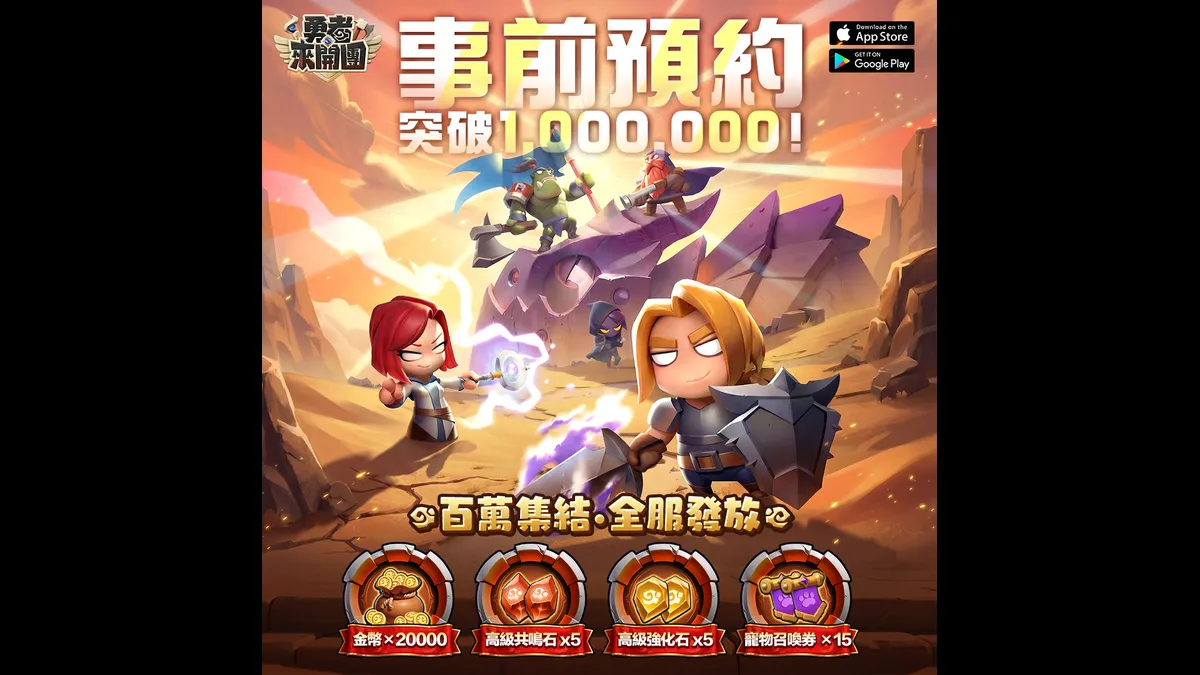 《勇者來開團》事前預約人數突破100萬,為感謝所有勇者們的熱情支持,全服已解鎖最終里程碑獎勵。所有玩家登入即可透過郵件領取以下獎勵: