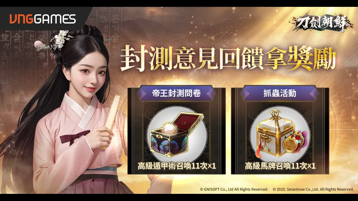 此次《刀劍朝鮮》封測除能進行遊戲體驗,玩家也有機會向官方提出意見,創造出自己期待的「朝鮮王朝」。官方於封測期間也同時推出「體驗問卷」與「抓蟲」活動,官方表示將廣採玩家意見進行遊戲優化與調整,而對於玩家實質反饋,官方也將提供高額且豐富的實質獎勵,期待與玩家能共創優質的遊戲體驗,詳細活動與獎勵細節請密切追蹤官方網站與官方臉書粉絲團.
