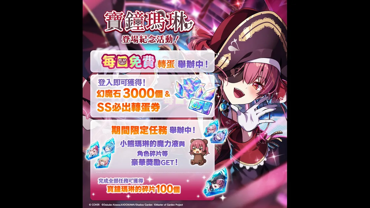 聯動活動將自 3 月 5日(四)起限時展開。活動期間每日登入即可獲得幻魔石、養成資源道具以及聯動角色免費轉蛋機會等多項獎勵。完成限時任務後,還能直接獲得「[寶鐘海賊團船長]寶鐘瑪琳」角色碎片x100,協助玩家快速培養角色戰力。