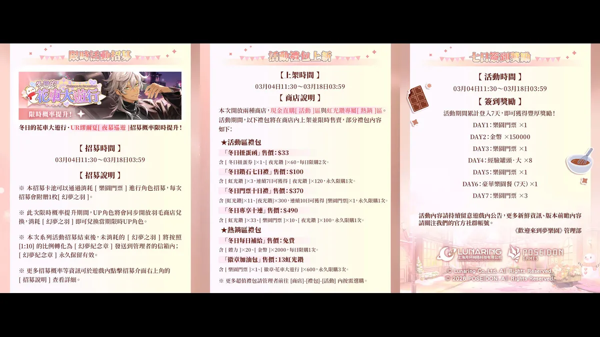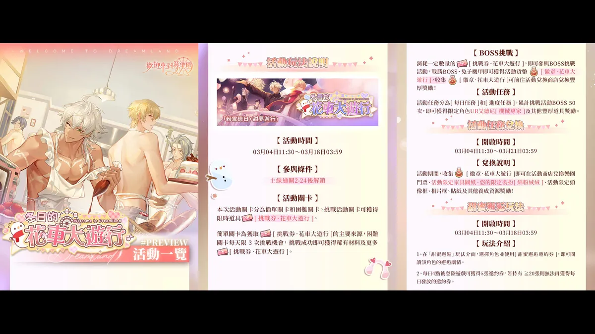 由 Juegos de Poseidón 代理發行的女性向手遊《歡迎來到夢樂園》於今(5)日推出全新限時活動「冬日的花車大遊行」,同步開放限定劇情關卡、活動挑戰與專屬招募卡池等更新內容;同時也推出情人節限定玩法「甜蜜邂逅」,能透過邀約與他展開專屬邂逅劇情,在冬日節慶氛圍中展開一段充滿浪漫與驚喜的夢幻旅程.
