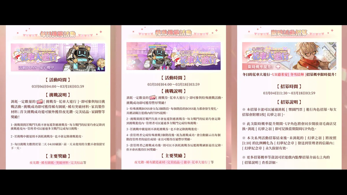 與此同時,也開放玩家挑戰活動關卡,活動期間可收集代幣「徽章.冬日的花車大遊行」 ,前往活動兌換商course即可兌換樂園門票、限定頭像框、相片框、貼紙及其他養成資源獎勵。