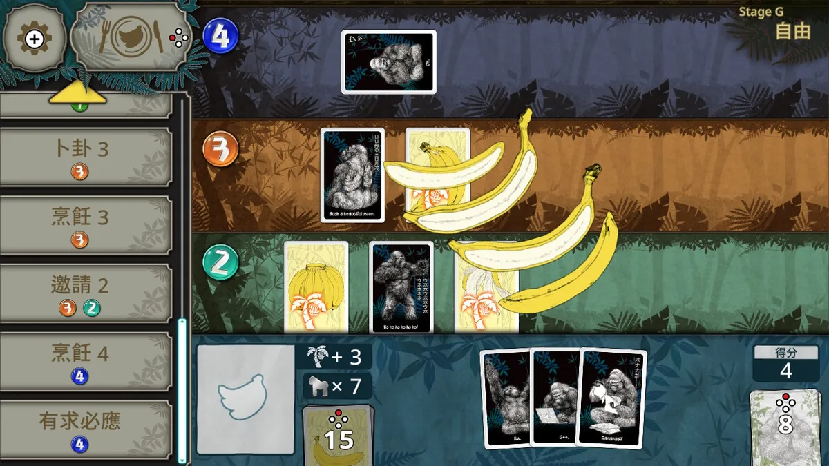 為了在遊戲中贏得勝利,必須讓7隻以上的猩猩排在牌面上,