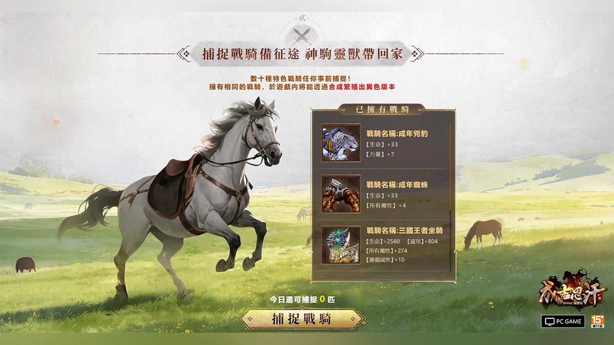 事前每日捕捉戰騎,可免費獲得多種神駒靈獸